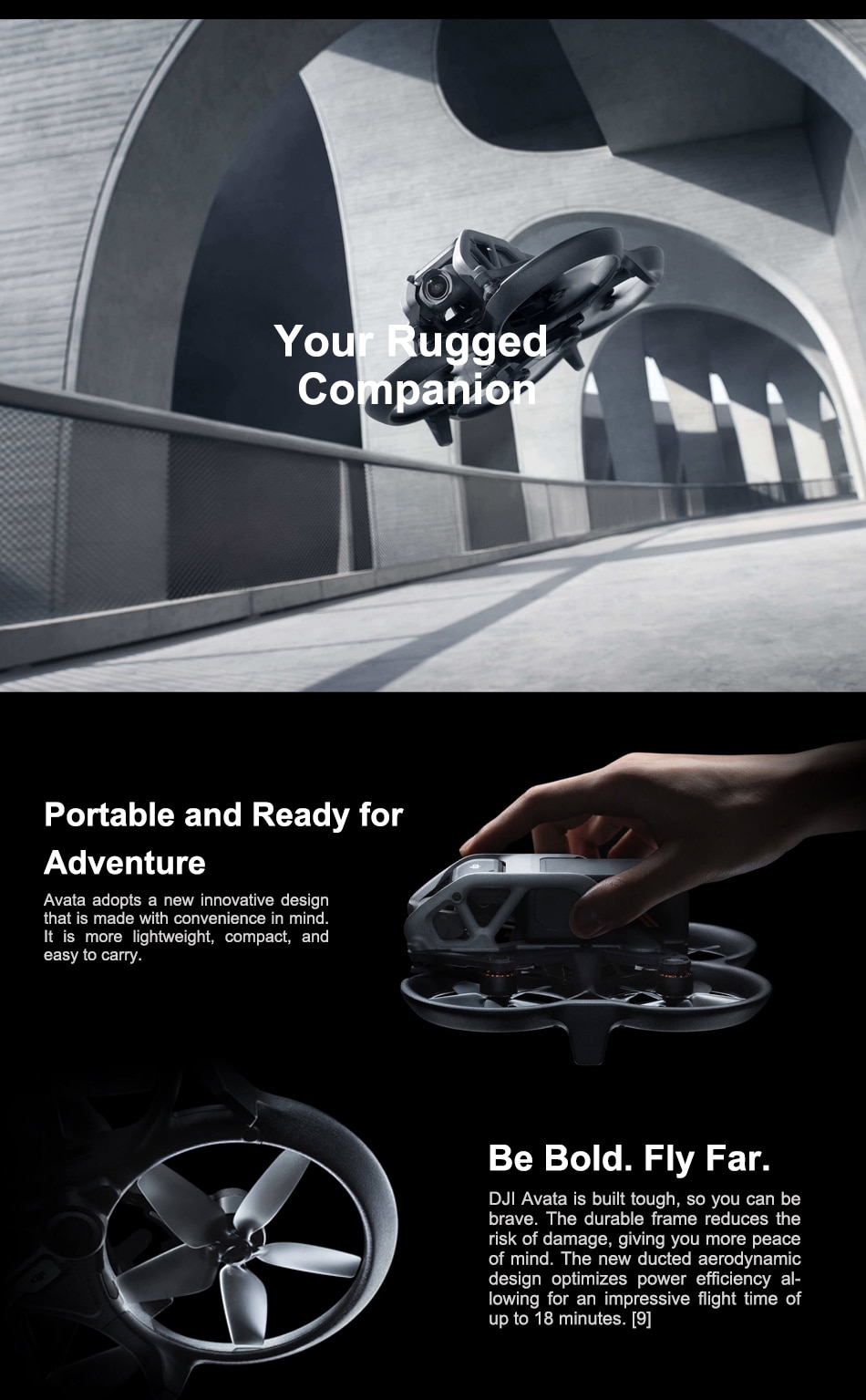 1. DJI Avata comes with a built-in propeller guard, so that the aircraft body is stronger and more durable, and can fly normally after minor collisions.