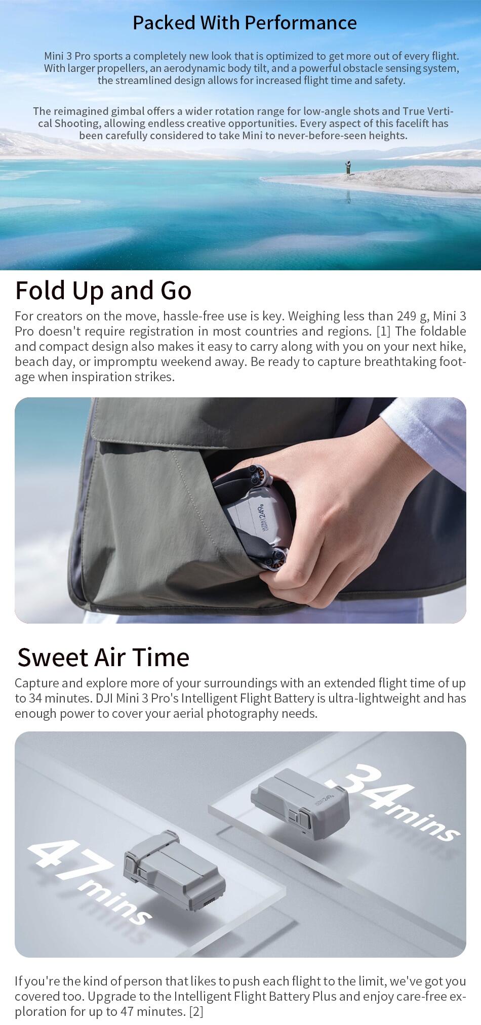 Specifically: Inheriting the 249 g light and compact body, DJI Mini 3 Pro comes with a 1/1.3-inch image sensor that supports native HDR. It supports three-directional obstacle sensing and the newly upgraded APAS 4.0 ( Pilot Assistance Systems). It supports DJI O3 FHD digital video transmission, ensuring a stable live feed at distances of up to 12 km. DJI Mini 3 Pro also supports intelligent features like FocusTrack, True Vertical , Timelapse, MasterShots, and High-Speed QuickTransfer.