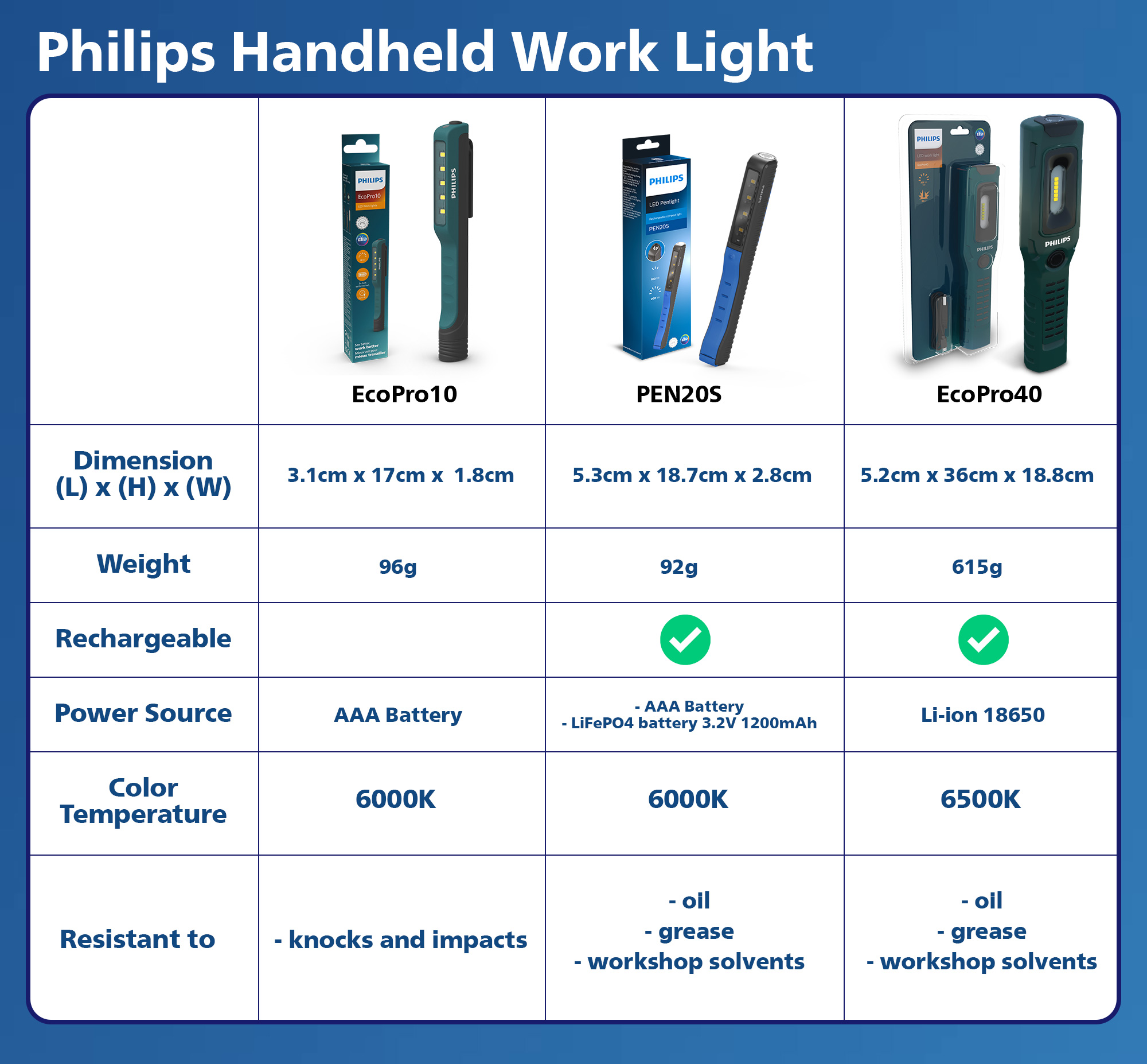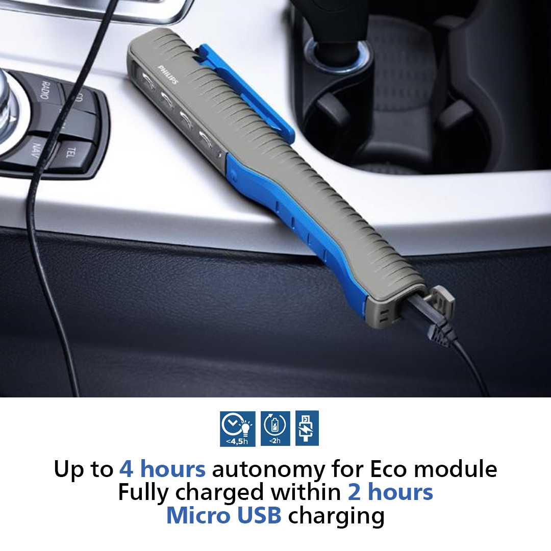 The Philips PEN20S is a compact penlight, ideal for quick inspection jobs. Its 4 high-quality LEDs provide a bright, natural white light of 6000 K, producing up to 200 lm, plus a 100 lm spotlight. Recharge via USB and use hands-free.