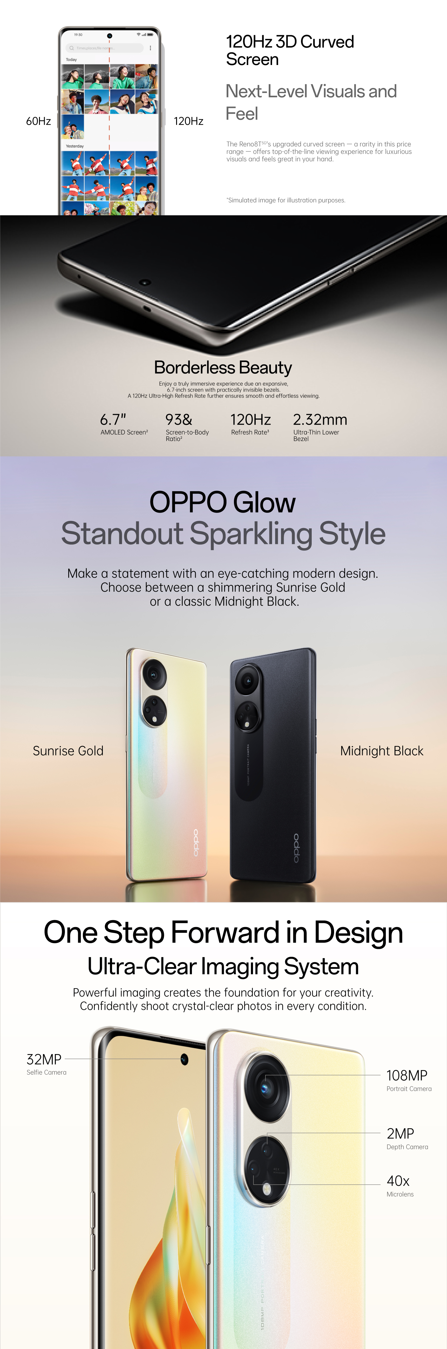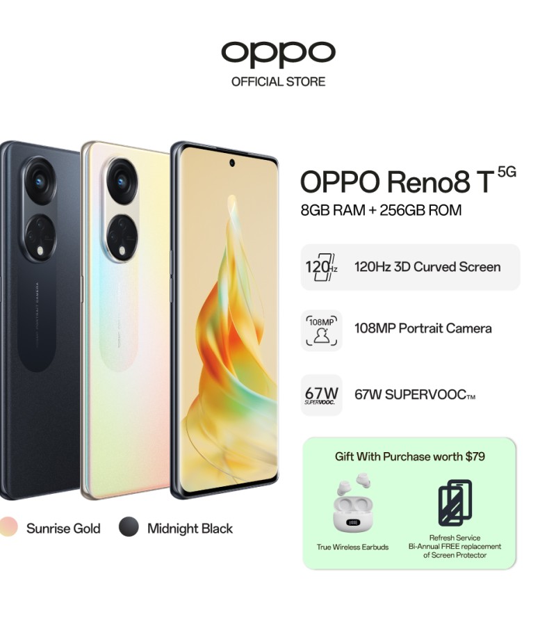 OPPO Reno8 T 5G/108MP人像相机/120Hz 3D曲面屏/67W SUPERVOOC/价值79美元的免费真无线耳机