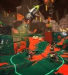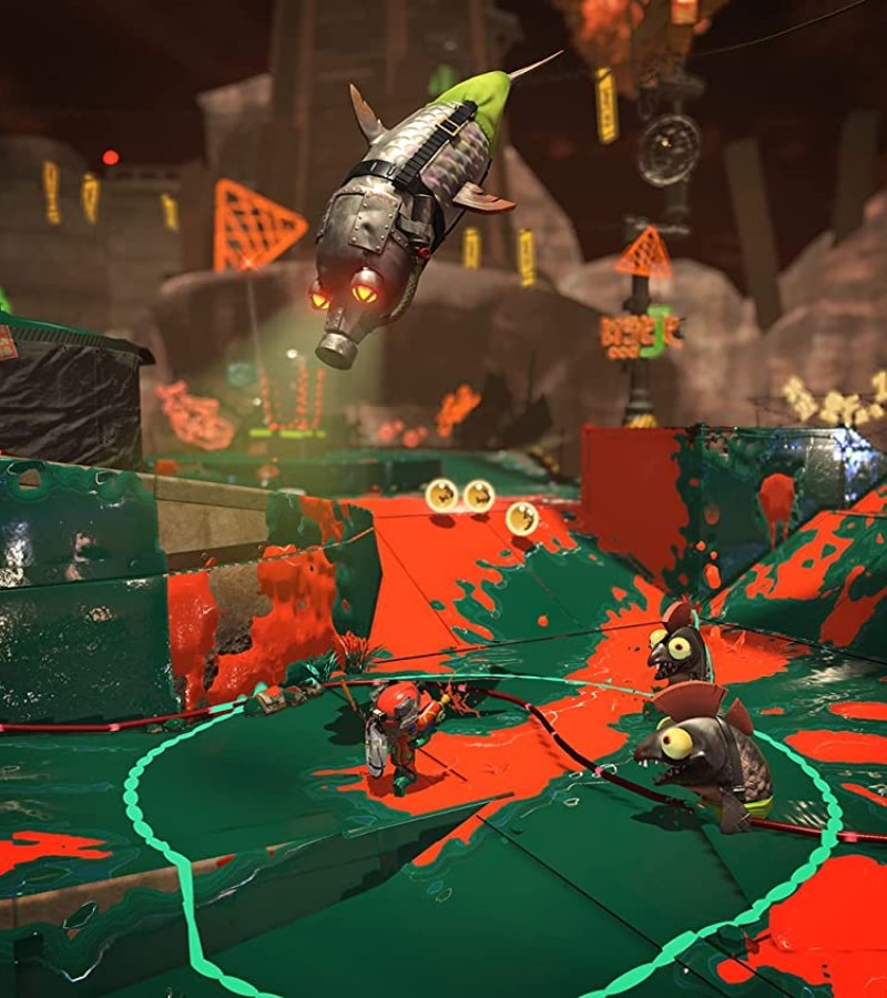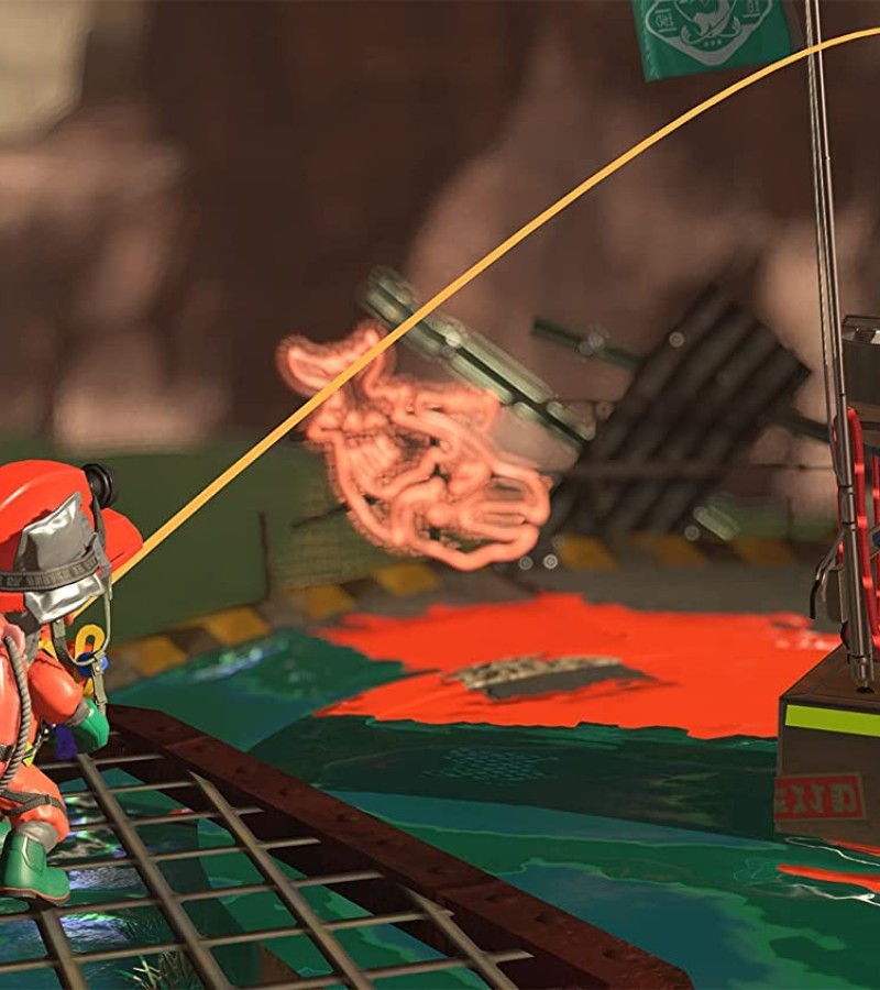 Even in this desolate environment, Turf War* reigns supreme, and battles rage in new stages located in the surrounding wilds. Dynamic new moves help these fighters dodge attacks and cover more ground, along with a new bow-shaped weapon to sling ink.